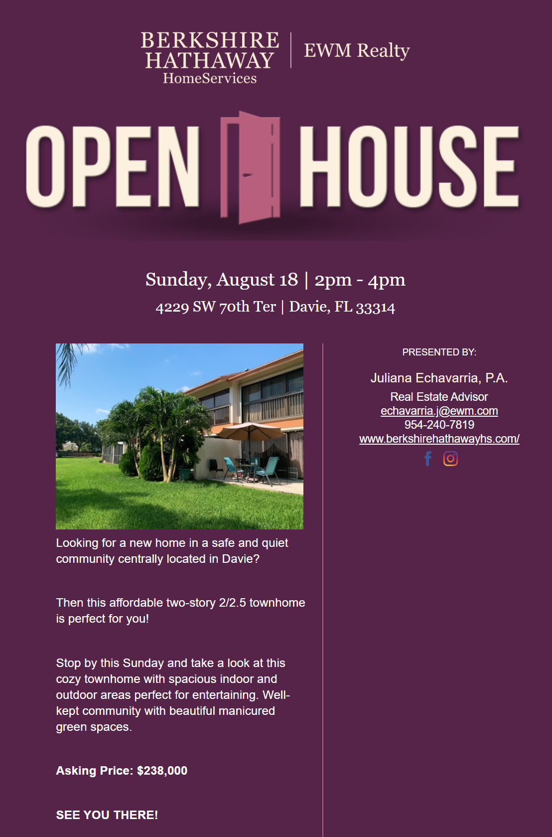 OPEN HOUSE! Cozy Two-Story 2/2.5 Town-home Centrally Located in Davie, Close to Nova University